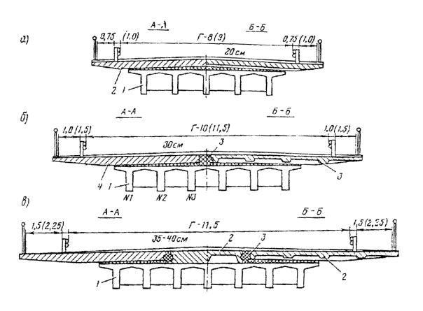 Рис. 3.3. Схемы уширения с помощью монолитной накладной плиты 3.6. Схемы уширения с помощью ребристой накладной плиты (в сборном или сборно-монолитном вариантах), а также не требующие уширения опор, применяют при увеличении габарита в основном на 2-5 м (а в отдельных случаях, при достаточном технико-экономическом обосновании - и более) в мостах с пролетами до 18 м и с пролетными строениями как разрезных, так и неразрезных систем (рис. 3.4). Расположенные поперек пролетного строения вертикальные ребра плит с заключенными между ними армированными швами замоноличивания выполняют роль дополнительных диафрагм, увеличивая поперечную жесткость пролетного строения, а также подкрепляют свесы консолей, что позволяет существенно увеличить их вылет. Уширение ребристой накладной плитой наиболее целесообразно в условиях, когда иные способы затруднены (например, при высоких опорах) и когда требуется существенное увеличение грузоподъемности существующего пролетного строения. При уширении предусматривают обеспечение совместной работы накладной плиты с существующими балками. Прочность, жесткость, трещиностойкость уширенных пролетных строений проверяют расчетом. Применение плоской плиты в сборном варианте недопустимо. Рис. 3.4. Схемы уширения сборной (а) и сборно-монолитной (б, а) накладной плитой: 1 - существующее пролетное строение; 2 - сборная ребристая накладная плита; 3 - монолитный шпоночный шов (сечения А-А - по поперечному стыку, Б-Б - по накладной плите 3.7. Уширение мостов с симметричным добавлением балок (плит) пролетных строений и с развитием только ригеля (группа В) предусматривает добавление по одной балке с каждой стороны (симметричное уширение) и может быть использовано при увеличении габарита от 1,5 до 2,5 м (рис. 3.5). При этом приставляемые элементы объединяют с существующей конструкцией по плите проезжей части или по плите и стенке балки (плиты), что позволяет в большинстве случаев облегчить работу старых балок в пролетном строении. Возможную разгрузку (т.е. возможность повышения класса по грузоподъемности по сравнению с фактическим) принимают по данным табл. 3.2, где также указаны и области рационального использования приведенных на рис. 3.5 схем. 3.8. Если по фактическому состоянию балки требуют разгрузки, а схемы уширения не обеспечивают ее (в табл. 3.2 значения равны 0), применение указанных схем уширения должно сопровождаться усилением существующих балок (плит) пролетных строений (например, методом наклейки арматуры). Комбинация приведенных схем уширения с устройством монолитной накладной плиты позволит увеличить не только габарит, но и степень разгрузки существующих балок, повысить их несущую способность дополнительно. 3.9. Уширение мостов с симметричным добавлением балок (плит) пролетных строений и развитием в стороны тела опор (группа Г) предусматривает добавление с каждой стороны по одной - две балки и может быть использовано при увеличении габарита на 2-3,5 м. При этом уширение осуществляют по схемам, аналогичным приведенным для группы В (рис. 3.6). Степень повышения класса элементов (балок) по грузоподъемности при таких схемах указана в табл. 3.3. Таблица 3.2