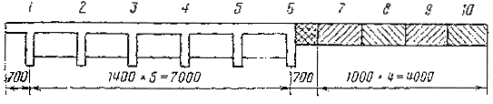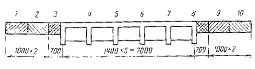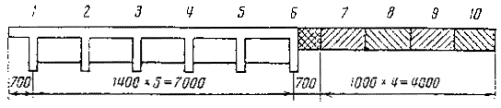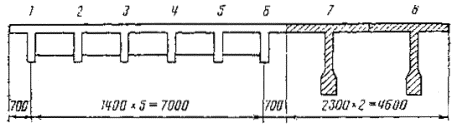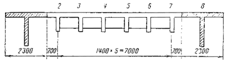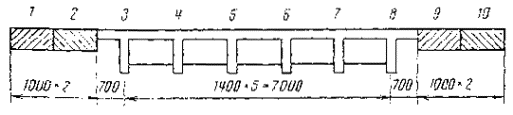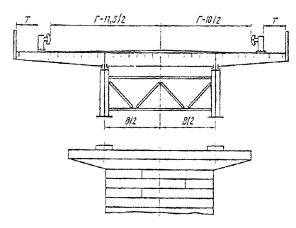 Рис. 7. Поперечное сечение, плитно-ребристого пролетного строения ПРИЛОЖЕНИЕ 2 (рекомендуемое)ОРИЕНТИРОВОЧНАЯ ОЦЕНКА НЕСУЩЕЙ СПОСОБНОСТИ СВАЙНЫХ ФУНДАМЕНТОВ МОСТОВ ПОСТРОЙКИ ДО 1962г.Возможность уширения опор со свайными фундаментами на крупных и средних песках и глинистых грунтах с I>0,4 без уширения фундаментов определяют на основании расчетов в соответствия с требованиями СНиП 05.03-84 и СНиП 2.02.03-85. В соответствии с этими расчетами для любых грунтовых условий в свайных фундаментах резерв несущей способности появляется за счет большего значения коэффициента kусв=Pt/P0 над kN=Nн/Nс, в которые входят характеристики, определяемые по новым и старым нормам: Рt - несущая способность сваи по грунту по СНиП 2.02.03-85; P0 - несущая способность сваи по ПиУ-48, определяемая по формуле