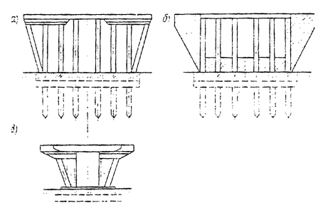 Рис. 9. Несущая способность деревянных свай d=28 см (а) и d=40 см (б) в песках влажных Ро.вл и средней влажности Ро.св: 1 - крупных; 2 - мелких; 3 - средней крупности ПРИЛОЖЕНИЕ 3 (рекомендуемое)МЕТОДИКА УСКОРЕННОЙ ОЦЕНКИ ВОЗМОЖНОСТИ УШИРЕНИЯ СВАЙНО-ЭСТАКАДНЫХ ОПОР (МЕТОДИКА УО)1. Ускоренная оценка распространяется только на промежуточные свайно-эстакадные (рис. 1, в, г, д) и береговые (рис. 1, е, ж) свайные опоры с вертикальными сваями (вып. 70). Конструкции опор рассмотрены при наиболее распространенных основных параметрах: а) увеличение габаритов: с Г-7+2Х0,75 до Г-8+2Х1,0; » Г-7+2Х0,75 » Г-10+2Х1,0; » Г-7+2Х0,75 » Г11,5+2Х1,5; » Г-7-8+2Х1,0 » Г-10+2Х1,5; б) длины пролетных строений по схемам 11,36 мХ3 и 16,76 мХ3; в) высоты опор промежуточных - от 3 до 6 м, береговых - от 2 до 5 м; г) глубина забивки свай - от 4 до 10 м; д) сечение существующих железобетонных свай - 30Х35 см, добиваемых - 35Х35 и 40Х40 см; е) грунты-пески, (средние, мелкие и пылеватые); супеси, суглинки твердые, полутвердые и тугопластичные. Грунты условно разделены на прочные (на рис. 3-6 обозначены сплошной штриховкой) и слабые (на рис. 3-6 обозначены пунктирной штриховкой). Рис. 1. Схемы мостов (а, б) и типы опор (в-ж) 2. При оценке несущей способности свай по грунту в промежуточных опорах рассмотрены случаи как однородных грунтов по длине свай, так и их сочетаний в два и три слоя (всего шесть сочетаний): а) прочный; б) слабый; в) слабый - прочный; г) прочный - слабый; д) прочный - слабый - прочный; е) слабый - прочный - слабый. При этом предполагается, что свая опирается на грунт, лежащий в ее нижней части. К прочным грунтам отнесены глинистые с коэффициентами консистенции 0<В<0,3, а также пески и супеси, кроме пылеватых; к слабым отнесены глинистые грунты с величиной В, лежащей в интервале 0,3<В£0,5, и пылеватые пески и супеси. При оценке несущей способности свай по грунту у береговых опор верхний слой грунта принят во всех случаях прочным, поскольку учитываемую в расчете насыпь у мостов отсыпают из дренирующих грунтов; в расчетах он принят в виде однородного уплотненного длительной эксплуатацией песка средней крупности толщиной 4 м с коэффициентом пропорциональности К=500 т/м4. Наряду с однородным прочным грунтом по длине свай рассмотрено еще два сочетания напластований, начиная сверху: прочный - слабый; прочный - слабый - прочный. 3. Усилия, приходящиеся на голову сваи, определены при следующих предпосылках: а) временные вертикальные нагрузки НК-80 и АК при числе полос движения - 2 (по одному в каждом направлении) со смещением по отношению к барьерному ограждению (или тротуару) в соответствии со СНиП 2.05.03-84; б) постоянная нагрузка для уширенных мостов принята в соответствии с наиболее рациональной конструкцией симметрично двустороннего уширения пролетных строений и опор. Рассмотрено уширение пролетных строений до габарита Г-10+2Х1,5 м ребристыми балками применительно к бездиафрагменным пролетным строениям по вып. инв. № 710/1 (по 11/2 с каждой стороны для габарита Г-10); уширение до габарита Г-11,5+2Х1,5 м - плитными пустотными блоками на ширину по 3,5 м с каждой стороны; в) определение усилий, передающихся на опору от тормозной силы Нх, произведено с учетом работы моста к насыпи как единой системы по методике, разработанной ВНИИ транспортного строительства. При этом рассмотрен вариант установки старых и пристраиваемых частей пролетных строений на резиновые опорные части. 4. При рас