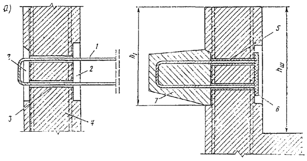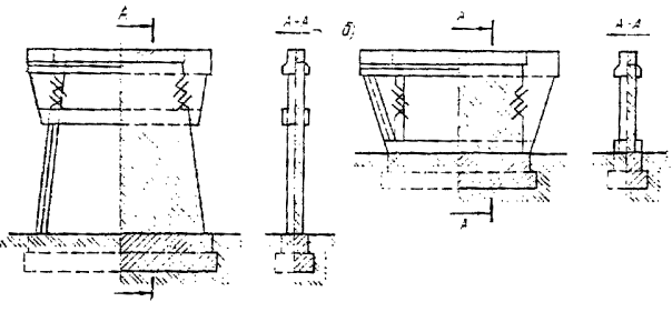 КОНСТРУКТИВНЫЕ ТРЕБОВАНИЯ4.43. При уширении ригеля добетонированием с устройством или без устройства кронштейнов обязательна связь арматуры существующей и дополнительных частей или соединение бетонных элементов анкерными стержнями. В случае передачи горизонтального усилия на тело уширяемой опоры через устраиваемую новую стенку торцы ригеля могут не объединяться по арматуре или стержням. Объединение бетона охватывающих поясов и рубашек со старым бетоном при уширении монолитных опор должно осуществляться установкой через 50 см в шахматном порядке арматурных штырей диаметром не менее 10 мм из арматуры класса A-III и обработкой старой поверхности бетона насечкой. 4.44. При разработке чертежей уширения опор путем развития фундамента и надфундаментной части следует иметь в виду, что новые фундаменты могут быть не связаны с существующим, если приняты меры по уменьшению неравномерности осадки опор. При отсутствии таких мер ригеля и фундаменты объединяют между собой. Допускаемую неравномерность осадки старой и новой частей опор определяют условиями надежности узла объединения балок пролетных строений и принимают равной 0.001b и 0,002b (b - расстояние между балками) в диафрагменных и бездиафрагменных пролетных строениях. 4.45. Конструктивные решения по уширению береговых опор должны по возможности исключать необходимость нарушения плотности насыпи за шкафной стенкой при производстве работ по уширению. При отсутствии такой возможности в чертежах должны указываться приемы восстановления плотности насыпи после окончания работ по уширению (послойное трамбование грунта до kупл³0,98, заполнение пазух цементогрунтом с тщательным трамбованием). Если в конструкции береговой опоры в пределах ее существующей части отсутствует возможность опирания на нее переходных плит, то к шкафной стенке пристраивают консоль (рис. 4.2). Если заглубление ее h1 не превышает 0,5h2; (h2 - высота насыпи), то при kупл³0,98 грунт насыпи считают слежавшимися; если h1>0,5h2, то упрочнение грунта насыпи не учитывают. В бесфундаментных устоях, уширяемых добивкой свай (см. рис. 3.20), новые расстояния между сваями ан могут отличаться от существующих ас; величину ан принимают не менее 6bс (размера сваи поперек моста), так как при ап<6bс для существующих свай увеличение их несущей способности по грунту не учитывают. 4.46. В схемах уширения группы А железобетонных пролетных строений при удовлетворительном состоянии гидроизоляции слои одежды удаляют вдоль тротуарных блоков на ширине не более 1 м со ступенчатой вырубкой по каждому слою для последующей их стыковки. Для схем уширения приставляемыми балками без устройства накладной плиты при удовлетворительном состоянии гидроизоляции в средней части существующего пролетного строения слои, кроме покрытия, удаляют вдоль тротуаров, оголяя продольный стык омоноличивания (накладки), а асфальтобетонное покрытие удаляют на всей площади моста. Причем арматуру плиты приставляемых балок стыкуют с оголенными накладками (рис. 4.3, а). В отдельных случаях, при наличии обоснования расчетом, бетон омоноличивания доводят до уровня существующего защитного слоя, поверх которого укладывают новый изоляционный слой (без удаления существующего слоя), а жесткость крайней оставшейся балки подсчитывают с учетом монолитного бетона над ней (рис. 4.3, в). При стыков
