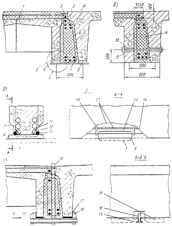 Рис. 4.8. Узел крепления поддерживающих консолей к ребру жесткости балки: 1 - горизонтальный элемент; 2 - уголки жесткости; 3 - ребро жесткости; 4 - фасовки; 5 - прокладки; 6 - подкос; 7 - болты крепления Рис. 4.9. Узел объединения монолитного ребристого пролетного строения с приставляемыми плитами (а, б) и балкой (в): 1 - плита; 2 - выравнивающий слой; 3 - ребро; 4 - заанкеренные в пробуренных отверстиях штыри; 5 - контур тротуара старого пролетного строения; 6 - плоскость сруба консоли; 7 - монолитный бетон вставки; 8 - арматура вставки; 9 - пустотная предварительно напряженная плита; 10 - закладная деталь в плите; 11 - опалубочный щит; 12 - монолитная плита; 13 - арматура монолитной плиты; 14 - консоль монолитной плиты; 15 - граница новой проезжей части; 16 - предварительно напряженная балка Таблица 4.10