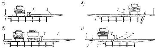 4.54. Объединение ребристых монолитных толстостенных железобетонных пролетных строений с приставляемыми сборными балками или плитами в отдельных случаях, когда с арматурой крайних балок сложно состыковаться, осуществляют с помощью горизонтальных или наклонных штырей, установленных в просверленные в стенке отверстия (рис. 4.9. а, б). Отверстия сверлят диаметром, на 2-5 мм превышающим диаметр стержня. Стержни (анкеры) изготавливают из арматуры периодического профиля Æ12-16 мм и устанавливают в отверстия, в которых предварительно залит клей на глубину не менее 10 диаметров. Допускается анкеровку стержней осуществлять путем зачеканки просветов между ними и стенками отверстия сухим цементным раствором с В:Ц=0,15. Стержни могут располагаться равномерно по фасаду или локально. В случаях, не требующих стыковки арматуры по стенке (см. п. 4.30), приставляемые элементы объединяют по плите (рис. 4.9, в). 5. ОСОБЕННОСТИ ПРОИЗВОДСТВА И ПРИЕМКА PAБОТТЕХНОЛОГИЧЕСКИЕ ТРЕБОВАНИЯ5.1. Все работы по уширению мостов следует выполнять, руководствуясь требованиями СНиП III-43-75 [10] и СНиП 2.01.01-82 [8]. Специальные требования, связанные с особенностями уширения, приведены ниже 1. ____________ 1 После уширения все характеристики сооружения, результаты испытания и приемки заносят в книгу искусственных сооружений. 5.2. Уширение моста или путепровода начинают с уширения опор и подходов. При уширении промежуточных опор путепровода подготовка ригеля или тела опоры может быть осуществлена без обстройки, но с использованием транспортно-подъемных средств - вертикальных и консольных подъемников. В мостах промежуточные опоры обстраивают подвесными ходами и лесами для выполнения работ по наращиванию ригеля и тела опоры. Для схем уширения, требующих развития фундаментной части, предварительно забивают сваи. Сваебойные работы целесообразно осуществлять в зимнее время с грунта или со льда. При необходимости забивки по одной - две сваи усиления с каждой стороны опоры работы по забивке сваи допускается вести с моста, используя при этом специальные механизмы, позволяющие забивать сваи сбоку. При нахождении такого механизма на мосту движение по сооружению прекращают. 5.3. При уширении устоев последовательность работ принимают следующей: забивают сваи, отсыпают конусы, наращивают ригель и шкафную стенку, укладывают переходные плиты. До забивки свай в конусе разравнивают площадку. Для случая забивки свай в заранее уширенную насыпь (конус) разравнивают площадки под каждую сваю, обозначая таким образом ее проектное положение. Работы по уширению устоев не требуют, как правило, обстройки. При уширении опор движение по мосту не прерывают. Рис. 5.1. Методы регулирования усилий: а - натяжение арматуры с пролетных строений; б - поддомкрачивание с промежуточной временной опоры; в, г - с подкосных рам Рис. 5.2. Схемы организации движения по мосту, уширяемому сборной накладной плитой: а, б - по одной полосе и установкой права преимущественного проезда; в - по двум полосам проезда; г - с выносом движения на консольный участок неладной плиты; 1 - существующее пролетное строение; 2 - блоки ограждения; 3 - консольные накладные плиты; 4 - средняя вставка; 5 - анкер 5.4. Для уширения промежуточных опор необходимо предварительно выполнить ее обстройку, обеспечивающую безопасное нахождение рабочих при выполнении опалубоч