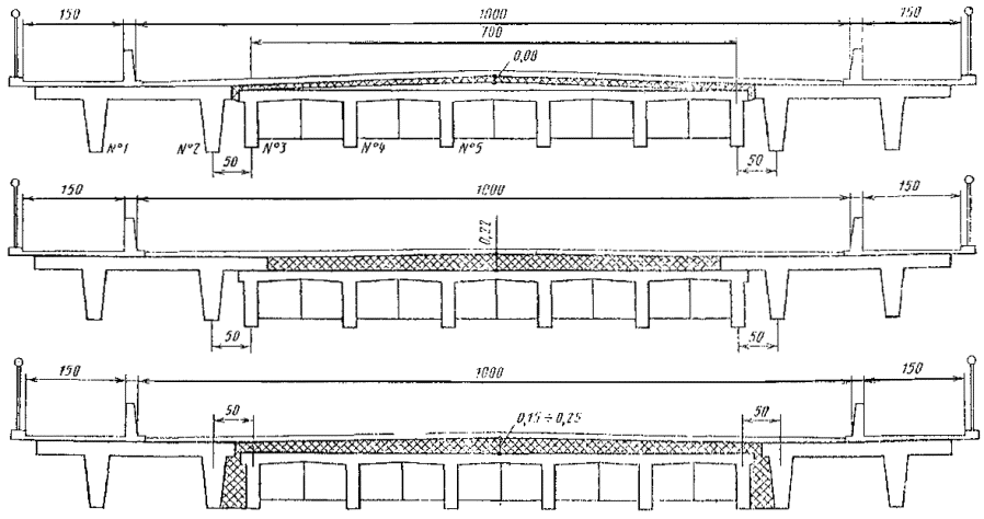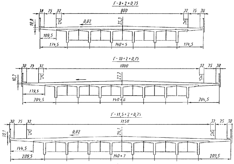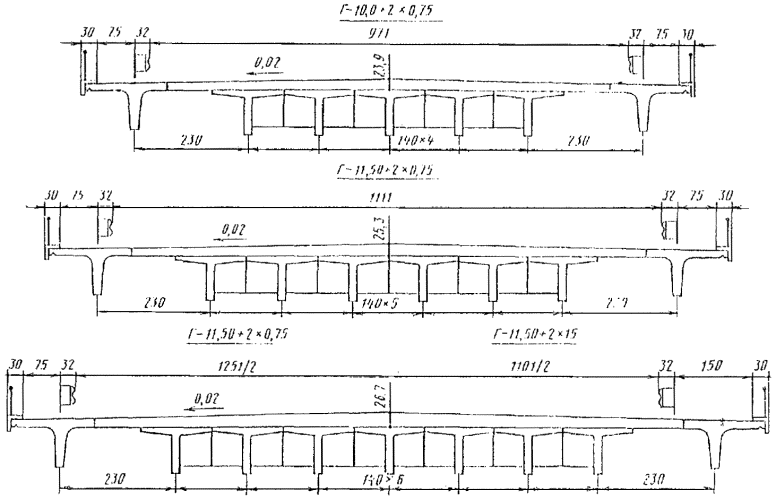 5. Пролетные строения без диафрагм из цельноперевозимых балок длиной 12, 15 и 18 м, армированных каркасной арматурой класса A-II. Союздорпроект, серия 3.505-14, вып. 1, инв. № 710/1, 1969. 6. Пролетные строения из составных балок длиной 18 и 21 м, армированных напрягаемой пучковой арматурой класса B-II (подвариант без диафрагм). Союздорпроект, серия 3.503-14, вып. 3, инв. № 710/3. 7. Железобетонные плитно-ребристые пролетные строения с пролетом 5 и 6 м. Союздорпроект, вып. 4, 1984. 8. Пролетные строения без диафрагм длиной 12, 15 и 18 м, армированные арматурой классов A-II, A-III. Союздорпроект, серия 3.503-14, вып. 5, инв. № 710/5, 1974.