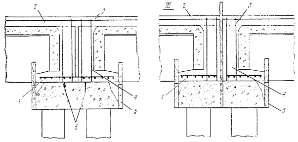 Рис. 6.4. Узел I (см. рис. 6.3): 1 - арматурная сетка по поверхности насадки из стержней A-I Æ 8 мм; 2 - продольная арматура в накладной плите (по расчетам на трещиностойкость); 3 - П-образные хомуты, охватывающие продольную арматуру сверху; 4 - бетон омоноличивания; 5 - щиты опалубки Таблица 6.5