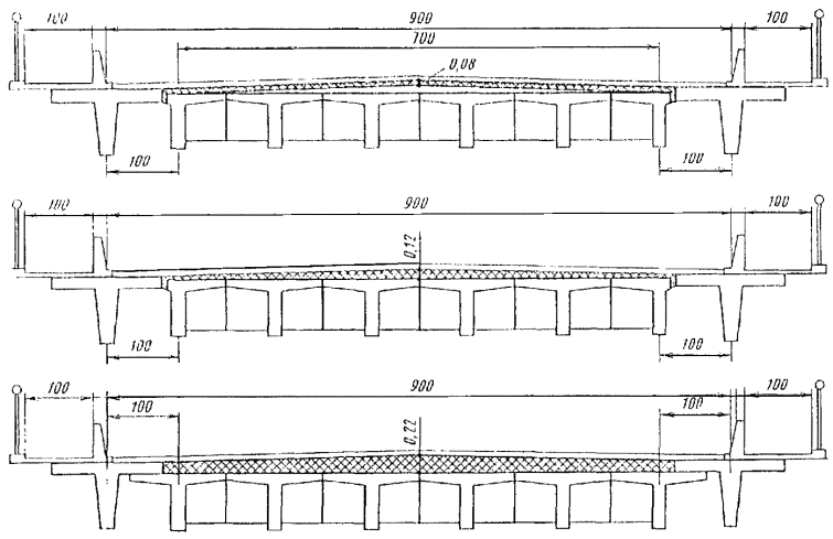 Даны три варианта уширения (рис. 6.7): 1) с частичным удалением слоев одежды (удалено покрытие, а по концам и другие слои) и усилением существующего защитного слоя; 2) с полным удалением слоев одежды и устройством монолитной плиты усиления диафрагм в пределах толщины сточного треугольника (дополнительная нагрузка на балки отсутствует); 3) с полным удалением слоев одежды и устройством монолитной плиты усиления диафрагм и балок. Значения расчетных и предельных моментов для четырех крайних балок схем уширения по рис. 6.7, а, б и в приведены соответственно в табл. 6.7-6.9. Они подсчитаны с учетом увеличенных несущей способности элементов и собственного веса конструкций. Значения момента Мр подсчитаны с учетом перераспределения нагрузки между балками за счет плиты усиления и придвинутых балок, а также с учетом негативного влияния длительных деформаций в новых элементах на напряженное состояние старых. Большая разница в отдельных случаях между Мпред, и Мрасч свидетельствует о возможности использования метода уширения при нарушенных поперечных связях (разрывах в накладках диафрагм).