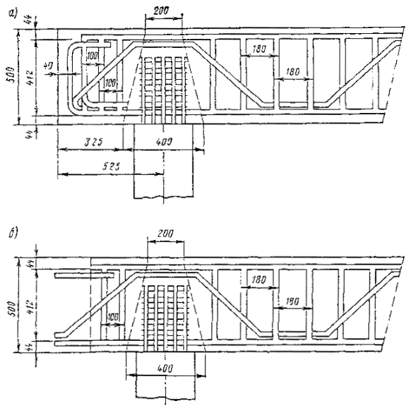 Рис. 6.11. Узел существующей свайной опоры: а - армирование ригеля до уширения; б - обрубка бетона на конце ригеля с оголением арматуры