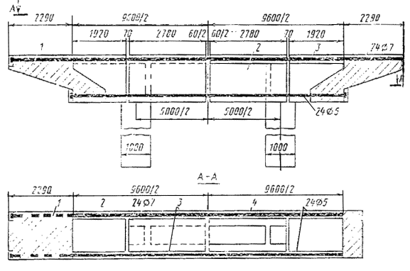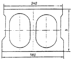 Рис. 6.12. Уширенная насадка опоры Рис. 6.13. Расположение дополнительных железобетонных блоков и напрягаемой арматуры в уширенной опоре: 1 - приставляемые сборные блоки уширения насадки; 2 - приставляемые сборные блоки стенок; 3 - верхние пучки; 4 - нижние пучки Показано уширение свайной опоры путем забивки дополнительных свай с двух сторон, уширением на 3 м ригеля со стыковкой арматуры (рис. 6.10-6.12); двухстолбчатой опоры с напряженным ригелем за счет уширения на 4-5 м ригеля железобетонными блоками, обжимаемыми дополнительными пучками (рис. 6.13). Взамен боковых сборных блоков может быть использован монолитный бетон или торкретбетон. ПРИЛОЖЕНИЕ 1 (справочное)ПЕРЕЧЕНЬ ТИПОВЫХ ПРОЕКТОВ ПРОЛЕТНЫХ СТРОЕНИЙ ЭКСПЛУАТИРУЕМЫХ МОСТОВ И ПОПЕРЕЧНЫЕ СЕЧЕНИЯ БАЛОК 1__________ 1 Характеристики балок приведены в таблице. 1. Пролетные строения железобетонные сборные с каркасной арматурой периодического профиля пролетами в свету 7,5; 10,0; 12,5; 15,0 и 20,0 м. Союздорпроект, вып. 56, 1957. 2. Пролетные строения из пустотных плит длиной от 6 до 18 м, армированных стержневой арматурой. Союздорпроект, серия 3.503-12, инв. № 384/25, 1969. 3. Унифицированные сборные пролетные строения из предварительно напряженного железобетона для мостов и путепроводов на автомобильных и городских дорогах. Союздорпроект, серия 3.503-12 инв. № 384/35, вып. 8 (7), 1970. 4. Пролетные строения из пустотных плит, армированных арматурой класса A-IV и A-V. Союздорпроект, серия 3.503-12, инв. № 384/43, 1974.