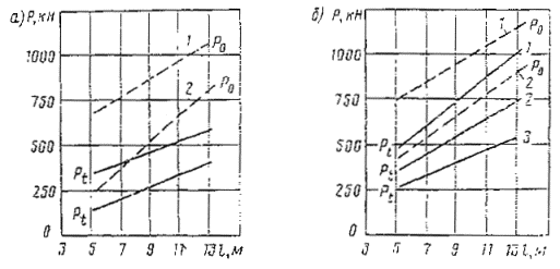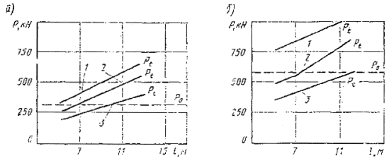 Рис. 8. Несущая способность деревянных свай d=28 см (а) и d=40 см (б) в сухих пестах: 1 - крупных; 2 - средней крупности; 3 - мелких