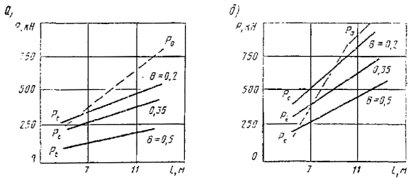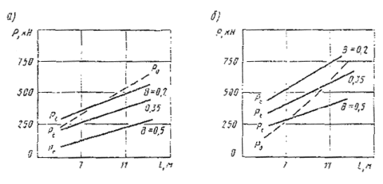 Рис. 5. Несущая способность деревянных свай d=28 см (а) и d=40 см (б) в сухих суглинках с различными коэффициентами консистенции В