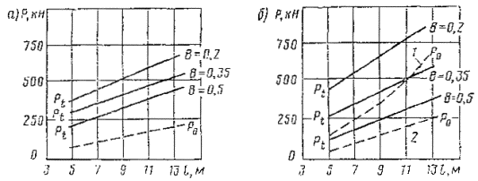 Рис. 7. Несущая способность деревянных свай d=28 см (а) и d=40 см (б) в глинах средней влажности и влажных с различными коэффициентами консистенции В: 1 - для глин средней влажности; 2 - для влажных глин