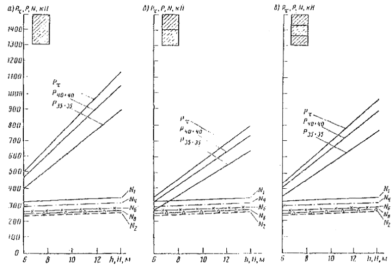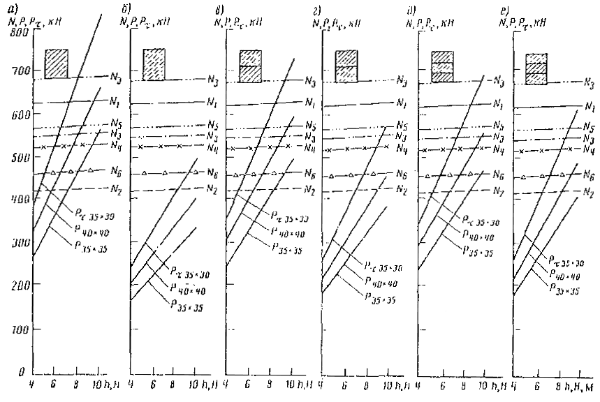 Рис. 6. Расчетные усилия в сваях устоя моста с длиной пролетных строений 16,76 м 8. Рассмотрены существующие береговые свайные двухрядные опоры (см. рис. 1, в). Графики, приведенные на рис. 5-6 для свайных опор мостов с пролетами 11,36 и 16,76 м, позволяют не только установить наличие или отсутствие необходимости уширения свайных опор, но и определить необходимую глубину H погружения вновь забиваемых свай в случае такой необходимости. Необходимость забивки дополнительных свай определяют по сопоставлению несущей способности свай с учетом упрочнения грунта за период эксплуатации Рt и N - максимального усилия в свае при соответствующем переходе со старого габарита на новый при фактической глубине забивки существующих свай h. Если при этом значение N находится в интервале (0,9¸1,1) Рt, то следует произвести уточняющий расчет. Если N>1,1 Pt, то забивка дополнительных свай не требуется, а если N<0,9 Pt, то необходима забивка дополнительных свай. Глубину погружения этих свай определяют по абсциссе точки пересечения линии несущей способности свай без учета упрочнения грунта Р с линией N, соответствующей переходу со старого габарита на новый. На рис. 3-6 усилия на сваю N1- N8 соответствуют уширению: N1 - c Г-7+2Х0,75 до Г-8+2X1,0 (nсв=5); N2 - » Г-7+2Х0,75 » Г-8+2Х1,0 (nсв=7); N3 - » Г-7+2Х0,75 » Г-10+2Х1,5 (nсв=5); N4 - » Г-7+2Х0,75 » Г-10+2Х1,5; N5 - » Г-8+2Х0,75 » Г-10+2Х1,5 (nсв=5); N6 - » Г-7+2Х0,75 » Г-11,5+2Х1,5: N7 - » Г-8+2Х0,75 » Г-10+2Х1,5 (nсв=7). ПРИЛОЖЕНИЕ 4 (обязательное)МЕТОДИКА ОПРЕДЕЛЕНИЯ УВЕЛИЧЕНИЯ НЕСУЩЕЙ СПОСОБНОСТИ ВИСЯЧИХ ЗАБИВНЫХ СВАЙ ПО РЕЗУЛЬТАТАМ ЗОНДИРОВАНИЯ ГРУНТОВ ОСНОВАНИЙ1. С целью определения фактических коэффициентов, учитывающих повышение несущей способности свайных фундаментов во времени, необходимы дополнительные инженерно-геологические исследования грунтов оснований в зоне фундаментов. Исследования рекомендуется проводить проектными изыскательскими организациями одновременно с инженерными изысканиями. Методика исследований предусматривает дополнительное зондирование грунтов оснований станками УБП-15М. На пойменных участках и у путепроводов зондирование производится непосредственно с земли; на участках открытых русел по возможности следует производить зондирование с предварительно отсыпанных островков. Метод динамического зондирования допускает также установку станка на плавучие средства. 2. У каждой пересчитываемой опоры закладывают по пять точек зондирования в обе стороны от фундамента. Точки зондирования следует располагать в плане на прямой линии, проведенной через центр свайного ростверка поперек оси моста на расстоянии 1; 2; 3; 5 и 10 м от края плиты ростверка. Глубину зондирования назначают на 2 м ниже отметки острия свай. Продолжительность полевых работ по зондированию грунтов у одной опоры не должна превышать трех суток. Зондирование грунта следует производить в направлении от ростверка к периферии. В процессе зондирования грунтов необходимо сопоставлять показатели по всем точкам, и в случае резких отклонений показателей назначать дополнительные точки зондирования на аналогичном расстоянии от грани плиты ростверка. В плотных грунтах допускается зондировать одну точку за несколько приемов с разбуриванием ранее пройденной части скважины. Уровни, с которых осуществляется каждый последующий этап зондирования, должны быть одинаковыми для всех точек у данной опоры. Указанный метод 