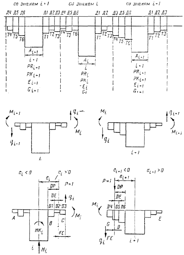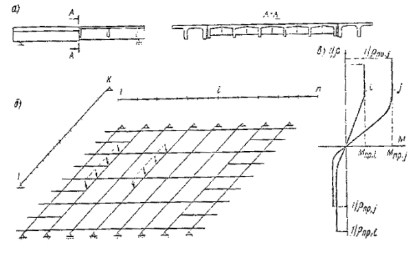 параметры напряженно-деформированного состояния, отвечающие условию (4), если Мпр³М*. П.п.п. SEPGU дает возможность рассчитывать сечения, имеющие не более двух групп зон, моделирующих бетон. При использовании п.п.п, SEPMY число групп зон не ограничено (в практике расчетов встречаются сечения с четырьмя группами зон). П.п.п. SEPGU и SEPMY имеются в распоряжении ВЦ ГипродорНИИ и МАДИ. Расчет уширенных пролетных строений с дефектами при учете физической нелинейности Определение усилий и перемещений в уширенных пролетных строениях с дефектами рекомендуется производить с использованием пространственной расчетной схемы в виде перекрестной системы стержневых элементов, имеющих нелинейную связь между усилиями и деформациями (рис. 2). Анализ такой расчетной схемы допускается производить с помощью п.п.п. ROSTV, которая имеется в распоряжении ВЦ ГипродорНИИ и МАДИ. Стержни первого уровня моделируют работу главных балок, элементы второго уровня - работу поперечной конструкция (плиты, диафрагмы). На стержне размещается сетка сечении; по каждому из них устанавливается диаграмма изгиба. Она учитывает наличие дефектов, влияющих на геометрию стержня (выколы, трещины, коррозия арматуры) и связанных с изменением свойств материалов (выщелачивание, карбонизация бетона). Рис. 2. Исходная информация для расчета пролетного строения (а), стержневая пространственная расчетная схема (б) и диаграммы изгиба сечений стержневых элементов (в) Решение задачи определения усилий и перемещений производят на основе метода сил с привлечением аппарата нелинейного математического программирования для решения нелинейной системы совместности перемещений. В качестве исходных данных вводят: информацию о геометрии системы (координаты начала и конца стержней, точек пересечения, положения сечений); данные о работе сечений (диаграммы изгиба); данные о нагрузке. В результате расчета по программе ROSTV устанавливают эпюры усилий и перемещений в системе, которые фиксируют в назначенных сечениях. Расчет уширенных железобетонных пролетных строений по программе PRNY Для определения величин hi может быть использована общая постановка метода коэффициента поперечной установки. На. основе этого метода составлена программа PRNY, в которой исходная информация и принятые допущения обозначены следующим образом: А - в поперечном сечении располагают балки с различными геометрическими характеристиками в общем случае (рис. 3). Б - распределение усилий между балками (плитами) происходит только в том поперечном сечении, где приложено внешнее сосредоточенное усилие. Это означает, что балки (плиты) пролетного строения как бы разделены продольными швами, оставляя соединенными только участки на рабочей ширине в рассматриваемом поперечном сечении с внешним усилием. Внешние усилия в поперечных сечениях распределяются независимо друг от друга. В - для каждой балки выделяют участок шириной А. Внутри этих участков балки работают на кручение как жесткие брусья без деформации их контура. Г - по бокам жесткой части назначают зоны АКлев и АКправ, характеризующие изгибаемые в поперечном направлении части сечения каждой балки. Д - поперечное сечение пролетного строения характеризуется параметрами, задаваемыми для каждой балки: момент инерции на кручение РК; модуль упругости материала К; модуль сдвига матери