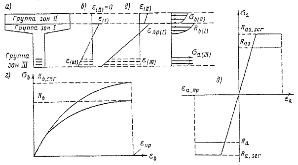 где m и m' - коэффициенты армирования соответственно для арматуры нижней и верхней зон сечения; уб и y'б - расстояние от центра тяжести бетонного сечения до центра тяжести арматуры нижней и верхней зон соответственно; а - расстояние между центрами тяжести бетонного и приведенного сечения; n - отношение модулей упругости арматуры и бетона; h - высота сечения; rб - радиус инерции бетонного сечения;