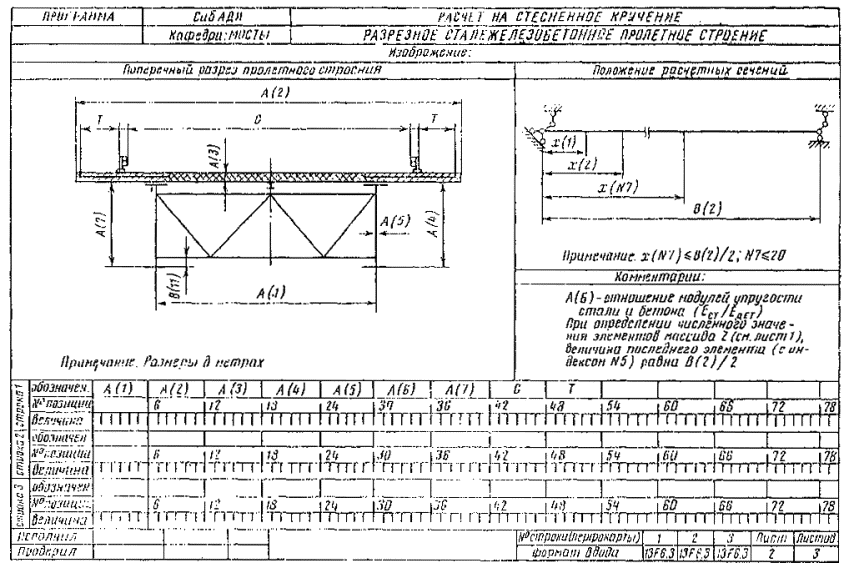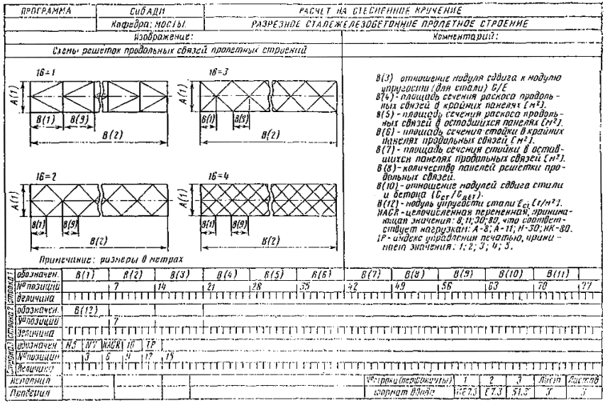 При этом полученную систему линейных уравнений решаем также методом прогонки. Прогоночные коэффициенты вычисляют по формулам (прямой ход): Cn-1=1/(4-3Cn-2); (10) jn-1=Cn-1(3jn-2+2hYn-2). Значения угла закручивания получаем аналогично (7) (обратный ход): qn-1=Cn-1qn+jn-1. Граничные условия представлены в виде: C0=01, j0=0, qN-1=jN-1. 2.2. Область применения программы ограничивается следующими возможностями: расстояние между главными балками не должно быть более 1/4 расчетного пролета; количество мест изменения сечения на половине пролета не более 10; количество одновременно рассчитываемых сечений не более 20 на половине пролета. 2.3. Ввод исходных данных осуществляется в соответствии с бланками, изображенными на рис. 4, 5, 6. Вывод информации производится в виде таблиц. При этом имеется пять вариантов печати - один основной и четыре дополнительных. Для назначения того или иного варианта служит индекс управления печатью IP, вводимый с исходными данными (см. рис. 6). Таблица 1. Варианты вывода информации