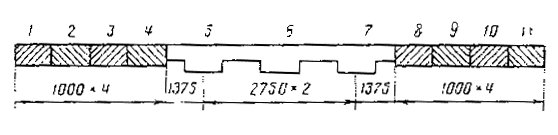 8. В табл. 15 приведены расчетные коэффициенты для пролетного строения из девяти унифицированных плит ТП [4], уширенного такими же плитами - по две плиты с каждой стороны. Длина плит 12 м. Расчетный пролет 11,4 м. Геометрические характеристики элементов приведены а таблице приложения 1 (строка 7). Таблица 15
