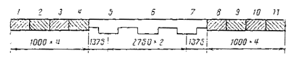 Значение изгибающих моментов в крайней балке старого пролетного строения (элемент № 3, см. табл. 4) для момента времени t (затухание ползучести бетона): от собственного веса элементов уширения М'3=h'3M'0=0,384·119,7=45,96 кН·м; от сил предварительного напряжения в элементах уширения М''3=h''3M''0= -0,327·193,2= -63,18 кН·м; от второй части постоянной нагрузки на элементах уширения М'''3=h'''3M'''3=0,515·65,6=33,78 кН·м. Суммарный изгибающий момент в элементе № 3 от всех рассмотренных нагрузок M=М'3+М''3+М'''3=45,96-63,18+33,78=16,56 кН·м. Вычисленное значение М является добавкой к значению изгибающего момента от постоянных нагрузок, действующего в элементе № 3 до уширения пролетного строения. 3. Таблицы коэффициентов h влияния длительных деформаций в бетоне 1. В табл. 1 и 2 приведены расчетные коэффициенты для пролетного строения из шести тавровых диафрагменных балок ТП [1], уширенного с одной стороны четырьмя унифицированными плитами ТП [2]. Длина элементов 11,36 м, расчетный пролет 10,8 м. Геометрические характеристики элементов приведены в таблице приложения 1 (строки 1, 2). Таблица 1
