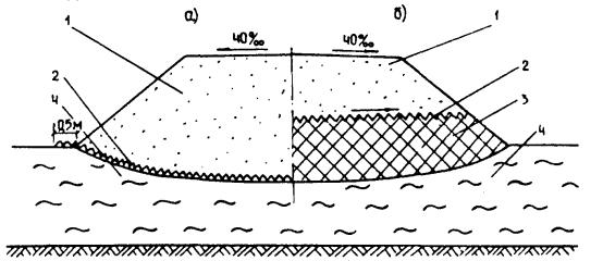 l - длина участка; р - давление насыпи. В порядке опытного внедрения предлагается конструкция насыпи с устройством по обеим сторонам ее прорезей в промерзшем слое торфа на всю его глубину (рис. 3) с прослойками из НСМ, либо проложенными на всю ширину насыпи с перекрытием прорези на три ее ширины, либо уложенными только над прорезями с выводом в каждую сторону от них не менее чем на три ширины прореза (см. рис. 3, б). Осадка насыпи с прорезями начинается сразу после отсыпки и интенсивно протекает в зимнее время. Насыпь в этот период имеет высокую жесткость, что исключает неравномерные осадки. Рис. 2. Коэффициент понижения требуемой степени консолидации насыпи Ку путем снижения неравномерности осадки в зависимости от уклона дна болота mо и параметра А Рис. 3. Конструкция насыпи с прорезями, перекрытыми прослойкой из НСМ, проложенной либо на всю ширину насыпи (а), либо над прорезями (б) с выпуском за пределы прорези не менее чем на три ее ширины: 1 - насыпь; 2 - бермы; 3 - прослойка из НСМ; 4 - прорезь шириной В; 5 - мерзлый торф; 6 - талый торф 3.6. В конструкциях насыпей из переувлажненных глинистых грунтов прослойка из НСМ может служить горизонтальным дренирующим элементом, способствующим выводу воды из тела насыпи. В этом случае прослойки из НСМ укладывают как самостоятельно, так и в комбинации с песчаными прослойками (рис. 4). В последнем случае НСМ помещают под песчаный слой, где материал играет роль фильтра, исключающего заиление песка и препятствующего перемешиванию песка с глинистым грунтом при отсыпке и уплотнении. При интервале между песчаными слоями по высоте меньше 0,7 м и использовании их для движения целесообразно укладывать дополнительные слои НСМ над каждым песчаным слоем. Минимальная толщина песчаного слоя, не используемого для проезда построечного транспорта, должна быть 15-20 см, а используемого для проезда - 25 см (или по расчету как для временной дороги). Прослойки из НСМ устраивают сплошными на всю ширину насыпи с поперечным уклоном 40 %0 и выводом краев полотен на откос. Рис. 4. Конструкции, насыпей с дренирующими прослойками из НСМ (a) или из песка с фильтром из НСМ (б): 1 - глинистый грунт; 2 - прослойка из НСМ; 3 - песчаная прослойка; 4 - слабый грунт Расстояние между прослойками из НСМ назначают исходя из заданных сроков консолидации насыпи и характеристик водопроницаемости насыпного грунта в соответствии с «Методическими рекомендациями по сооружению земляного полотна автомобильных дорог из грунтов повышенной влажности» (Союздорнии. М., 1980). Если прослойка должна выполнять дополнительные функции, например, гидроизолирующие, то она может быть дополнена полиэтиленовой пленкой, укладываемой непосредственно под прослойкой или над ней. Повышение устойчивости насыпи путем армирования основания или тела насыпи прослойками из НСМ3.7. Армирующие прослойки в основании насыпей повышают устойчивость последних за счет увеличения жесткости нижней части насыпи и соответствующего снижения напряжений в основании. Прослойки укладывают в одном или двух уровнях, причем нижнюю прослойку укладывают непосредственно на естественное основание, а вторую на 50-100 см выше. В некоторых случаях обе прослойки объединяют в одну конструкцию - обойму, плотно охватывающую нижний слой насыпи. Различают замкнутую и разомкнутую обоймы (рис. 5). Разомкнутая обойма пред