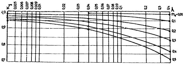где s1 и s3 - наибольшее и наименьшее главные напряжения от временной нагрузки под центром штампа; Сс и jс - сцепление и угол внутреннего трения подстилающего грунта (устанавливаются по табл. 6); КN - коэффициент условий работы. Наиболее опасной точкой считается точка под центром штампа. 3.19. При расчете по второму принципу реализуется армирующий эффект прослойки из НСМ, работающей на растяжение при образовании колей. По условию движения глубина колей ограничивается максимально допустимой величиной, составляющей 0,1 диаметра колеса автомобиля. Это колея образуется либо в результате пластических деформаций сдвига под колесом либо вследствие компрессионного уплотнения торфа в колее. Соответственно расчет ведут по двум условиям: по условию возникновения колеи выдавливания, связанному с полной несущей способностью, и по допустимой глубине колеи уплотнения, считая окончательным большее значение hn. Расчет допустимой глубины колеи выдавливания сводится к проверке условия: рф£ркр+кррт, (17) где рф - нагрузка от колеса и собственного веса насыпи (рис. 9); ркр - критическая нагрузка на основание согласно решениям теории предельного равновесия; кр - коэффициент распределения напряжений, определяемый по рис. 10; рт - часть нагрузки, воспринимаемая прослойкой. Расчет допустимой глубины колеи уплотнения сводится к проверке условия: осадка вследствие уплотнения слабого грунта под нагрузкой от колеса Sрасч не превысит допустимой глубины колеи Sдоп, т.е.: Sрасч£Sдоп, (18) 3.20. В расчете по допустимой глубине колеи выдавливания действующую на основание фактическую нагрузку от колеса диаметром Дк с диаметром отпечатка До и собственного веса насыпи определяют по формуле: рф = крро+q, (19) где ро - удельное давление от расчетного колеса на поверхности насыпного слоя; q - нагрузка на прослойку от собственного веса насыпи, ориентировочная высота которой принимается по табл. 2 q = grнhn - обозначения см. формулу (14). Таблица 6 Расчетные характеристики переувлажненных грунтов