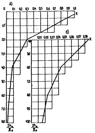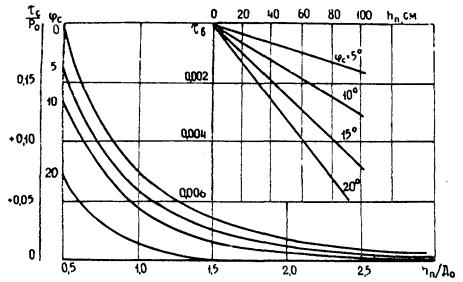 глубины а - при изменении относительной глубины от 0 до 8, б - то же, от 4 до 10 Рис. 11. Зависимость коэффициентов М1, М2, М3 от угла внутреннего трения слабого грунта jс 3.22. Расчет толщины насыпи по предельному равновесию при сдвиге ведется методом последовательных приближений с определенном по графику рис. 12 активного напряжения сдвига от временной нагрузки tc, поправки на собственный вес tв = grнhntgjс и последующей оценкой предельного равновесия исходя из условия: tc - tв£КNCC. (23) Исходными данными для расчета служат характеристики действующей или расчетной нагрузки, удельное давление р0, диаметр отпечатка колеса Д0, приведенная интенсивность движения N (см. табл. 3), естественная влажность грунта We, предел текучести WT и определяемые по табл. 6 прочностные характеристики слабого грунта Сс и jc, а также угол внутреннего трения насыпного грунта jн. Расчет предусматривает