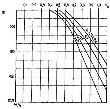 трения грунтов над прослойкой и под ней; Е - условный модуль деформации НСМ, Н/см (см. п. 2.7). Рис. 9. Схема расчета толщины насыпи hн с прослойкой из НСМ, обеспечивающей допустимую глубину колей по условию движения: 1 - насыпь; 2 - прослойка из НСМ; 3 - слабый грунт 3.21. Глубину колеи уплотнения Sрасч определяют по формуле: где Ес - расчетный модуль деформации слабого грунта, принимаемый по данным испытаний на компрессию или по табл. 5; Uк - расчетная степень консолидации, равная 0,6. При проведении массовых расчетов для заданных характеристик грунтов, НСМ и действующей расчетной нагрузки толщину насыпи hn целесообразно определять с помощью предварительно построенных графиков зависимостей Pт = f(hn; E); Ркр = f(hn; jc; Cc); hn = f(we; Е). Пример построения графиков и определения hn приведен в приложении 2. Рис. 10. Зависимость
