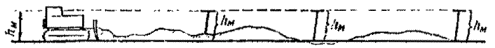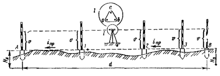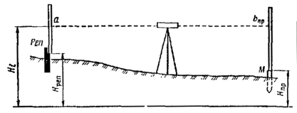 Рис. 1.8. Схема для определения высотного положения точки М 1.3.10. Способ створов. Последовательность работ (рис. 1.7): от опорной точки А, откладывая проектное расстояние а, получают начальную точку D створа DС. От нее откладывают расстояние в и получают плановое положение проектной точки М. 1.3.11. Определение на местности высотного положения проектной точки производится методом нивелирования из середины (рис. 1.8). Для этого устанавливают нивелир в рабочее положение между репером (связующей точкой) и проектной точкой М, плановое положение которой известно. Производят отсчет а по рейке, установленной на репере, и вычисляют горизонт прибора Нi=Hреп+а. Определяют отсчет на проектную точку (разность между горизонтом прибора Нi и высотой проектной точки) bпр=Нi - Нпр. В проектной точке М забивают кол так, чтобы отсчет по установленной на него рейке был равен вычисленному отсчету bпр. 1.3.12. Допускается на крутых склонах высотное положение проектных точек определять при помощи тригонометрического нивелирования или методом ватерпасовки склона надлежащей точности. 1.3.13. В необходимых случаях разрешается обозначить высотное положение проектной точки горизонтальной чертой на стенах существующих зданий, сооружений, на деревьях и пр. 1.3.14. Перенесение на местность линии заданного уклона производится наклонным лучом геодезического прибора (нивелира, теодолита и т.п.). При работе нивелиром (рис. 1.9) ею устанавливают примерно в середине переносимой линии. По высоте НА исходной точки А, расстоянию d и заданному уклону iпр, вычисляют высоту точки В (НВ=НА+diпр) и переносят ее на местность по методу, изложенному в п. 1.3.11. Наклоняют визирную ось зрительной трубы нивелира подъемными винтами а и в так, чтобы отсчеты по рейкам, установленным в точках А и В, были одинаковы (u). В точках 1, 2, 3 забивают колья так, чтобы отсчеты по установленным на них рейкам получились равными u.