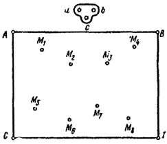 Рис. 1.10. Схема сгущения точек линии заданного уклона визирками 1.3.15. Для сгущения точек линии заданного уклона допускается использование визирок. В этом случае для разбивки положения этой линии по высоте между ее конечными точками А и В (рис. 1.10) ставят ряд промежуточных 1, 2 и т.д. В соответствии с этим в точках А и В устанавливают визирки, а в точках 1, 2 забивают колы так, чтобы визирка, поставленные на них, оказались на уровне взгляда между визирками в точках А и В. 1.3.16. Перенесение на местность проектной плоскости производят наклонным лучом нивелира (рис. 1.11). Четыре точки плоскости (А, В, С, D) выносят на местность методами, изложенными в пп. 1.3.11 и 1.3.12. Устанавливают нивелир между точками А и В так, чтобы подъемные винты а, b были параллельны линии АВ. Действуя винтами а, в, наклоняют визирную ось нивелира так, чтобы отсчеты по рейкам, поставленным в точках А и В, были одинаковыми. Действуя винтом с, наклоняют визирную ось до получения такого же отсчета по рейке, установленной в точке С. Производят контрольный отсчет по рейке, установленной в точке D, который должен быть одинаковым с отсчетами по рейкам в точках А, В, С. В случае расхождения работу повторяют. По всей поверхности в необходимых точках М1, М2 ... забивают колышки так, чтобы отсчеты по рейкам, установленным на них, были равны отсчету в основных точках А, В, С, D. 1.4. Планово-высотное обоснование разбивочных работ1.4.1. Все геодезические работы при разбивке искусственных сооружений производятся с исходных опорных точек и линий планово-высотного обоснования. 1.4.2. Исходной основой создания планово-высотного обоснования строительства являются точки государственной и ведомственной геодезических опорных сетей, а также опорные точки магистрального хода, выполненного при изысканиях и проектировании дороги и ее искусственных сооружений. 1.4.3. Проект опорной сети строительства с подетальной разбивкой каждого сооружения составляется проектной организацией и согласовывается с главным инженером строительства. При этом должны быть рассмотрены разные варианты планово-высотного обоснования строительства и методы детальной разбивки сооружения. Выбранный вариант должен отвечать условиям экономичности и качества строительных работ с учетом технических возможностей геодезической службы.