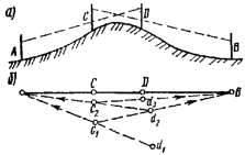 Рис. 3.2. Схема вешения линии А способом на себя: а - профиль; б - план 3.1.11. Прокладка на местности прямых линий трассы и осей инженерных сооружений начинается с вешения и линейных измерений. 3.1.12. Вешение выполняется на глаз при помощи бинокля или теодолита. Вешение ведется способом на себя. 3.1.13. Для вешения линии АВ (рис. 3.2) способом на себя наблюдатель встает в точке А. По его указанию рабочий устанавливает веху l на линии АВ и створе с вехой в точке В, затем веху 2 в створе с вехами в точках l и В и т.д. После установки всех вех производится проверка: наблюдатель встает за вехой А приблизительно в 5 м на продолжении линии АВ и смотрит, закрывают ли вехи одна другую, при отклонении их положение исправляют. 3.1.14. Вешение через холм (рис. 3.3) производится последовательными перемещениями наблюдателя и его помощника: наблюдатель встает в точку d1 и устанавливает помощника и точку c1 в створ линии d1А. Затем помощник перемещает наблюдателя из точки d1 в точку d2 в створ линии c1В. После этого наблюдатель перемещает помощника в точку c2 в створ линии d2А и так до тех пор, пока точки D и С не окажутся в створе линии АВ. 3.1.15. Вешение линии АВ через овраг (рис. 3.4) целесообразно выполнять при помощи теодолита. Устанавливают теодолит и рабочее положение в точке А и наводят зрительную трубу на веху в точке В. Наклоняя зрительную трубу, последовательно устанавливают вехи в точках 1; 2; 3; 4; 5; 6. В случае отсутствия видимости некоторых точек при положении теодолита в точке А его переносят в точку В и, повторяя те же действия, устанавливают вехи в точках, не просматриваемых из первоначального положения. 3.1.16. Восстановление пикетажа ведется от начала трассы или от последнего пикета ранее восстановленного участка. При этом закрепляются все пикеты и плюсы запроектированного продольного профиля. 3.1.17. При смыкании и встрече противоположных ходов допускаются «рубленые» пикеты длиной 50-150 м. На их фиксацию должно быть уделено особое внимание.