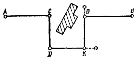 Рис. 3.6. Схема продления створа трассы параллельным смещением 3.1.18. При прокладке линий на большие расстояния производят «продление створа» при помощи теодолита (рис. 3.5). Для этого в точке С, положение которой было ранее определено, устанавливают теодолит и визируют на точку А при круге право (КП), затем, переведя трубу через зенит, выставляют по направлению визирной оси веху в точке d1 на большом, но хорошо просматриваемом расстоянии. Для устранения влияния коллимационной ошибки работу повторяют при наведении зрительной трубы на точку А при круге лево (КЛ). В результате выставляют вторую веху в точке d2. Разделив расстояние d1 d2 пополам, получают окончательное положение точки D на линии АВ. При необходимости продления створа работы выполняются из точки D относительно линии DC. 3.1.19. При встрече с препятствиями продления створа линии производится способом построения на линии створа прямоугольника или треугольника. В первом случае в точках С, D, К, О (рис. 3.6) при помощи теодолита (или эккера) строят прямые углы и откладывают отрезки СD, DК, КО. Отрезок КО при этом откладывают равным отрезку СD. Прямая ОВ будет продолжением линии АС, и вся длина прямой линии АВ будет равна сумме отрезков АС+DК+ОВ. Для продления створа способом построения на нем равностороннего треугольника (рис. 3.7) в точке С строят угол a=120° и по направлению визирной оси зрительной трубы теодолита откладывают отрезок СD. В точке D строят угол b=60° и по направлению визирной оси откладывают отрезок DE=СD. В точке Е строят угол g=120°. Прямая ЕВ является продолжением линии АС, а длина АВ равна сумме отрезков АС+СЕ+ЕВ. При построении на створе произвольного треугольника (см. рис. 3.7) его углы a¢ и b измеряют, сторону СD откладывают, значение угла g¢ вычисляют по формуле g¢=180°-a¢-b, а стороны треугольника DЕ и СЕ вычисляют, используя теорему синусов: