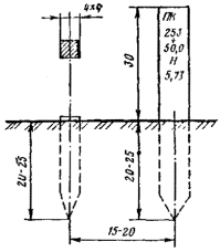 Рис. 3.19. Грунтовые реперы 3.4.17. Реперы при закреплении трасс автомобильных дорог устанавливают двух типов: постоянные и временные. В качестве постоянных реперов используют незыблемые во времени точки, вделанные в цоколи каменных здании капитального типа, в устои мостов или выступы слабовыветривающихся скал. Для установки временных реперов используют точки, расположенные на выступах различных зданий и сооружений, а также точки в виде металлических труб, рельсов или деревянных столбов, устанавливаемых в грунте. 3.4.18. При восстановлении трасс автомобильных дорог чаще применяют грунтовые реперы (рис. 3.19) в виде деревянных столбов, отрезков рельсов или пней деревьев. Грунтовые реперы должны быть закопаны на глубину ниже наибольшего промерзания грунта. Расстояние между реперами должно быть не более 3 км в равнинной и 1 км в пересеченной и горной местностях. 3.4.19. Временные дополнительные реперы разрешается совмещать с выносными столбами закрепления трассы в плане. В таких случаях они выделяются особым знаком. 3.4.20. Для высотной привязки трасс, мостов и дорожных сооружений использую постоянные стенные реперы а и марки б (рис. 3.20). Положение знаков закрепления таких нивелирных точек подробно описывают в проекте с приложением эскизного чертежа здания и указанием планового и высотного местоположения знака относительно цоколя и углов здания. 3.4.21. Стенными реперами и марками закрепляют линии нивелирования через каждые 5-7 км, а в малонаселенных местах - через 10-15 км.