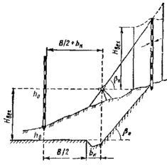 Расчеты производятся на микрокалькуляторах. 4.5.5. При сложном поперечном профиле косогора разбивка бровки выемки полотна производится ватернасовкой с помощью контрольного шаблона, уровня и рейки (рис. 4.7) или теодолитом. 4.5.6. Разбивка наклонным лучом трубы теодолита (рис. 4.8) выполняется из точки поперечника, отстоящей от трассы на расстоянии половины ширины, земляного полотна. Поставив теодолит над этой точкой поперечника, устанавливают визирный луч его трубы горизонтально (ставят отсчет по вертикальному кругу, равный месту нуля) и берут отсчет h0 по рейке, стоящей в осевой точке поперечника. Величину полученного отсчета прибавляют к рабочей отметке (глубина выемки) поперечника и получают высоту вехи по бровке выемки Нвех= h0+ hв. Далее ставят визирный луч теодолита параллельно откосу, для чего на вертикальном круге устанавливают отсчет, соответствующий углу наклона откоса выемки b0. После этого, двигая веху высотой Нвех по створу поперечника вдоль косогора, ищут точку, в которой визирный луч будет проходить, через верх вехи. Найденная точка будет находиться на бровке выемки земляного полотна.