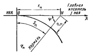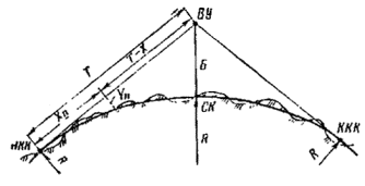 5.3.4. Отрезки касательной ln и нормали mn к клотоидной кривой, а также угол между касательной клотоиды, проведенной в точке начала кривой и нормалью к кривой в точке разбивки yк устанавливают по формулам: