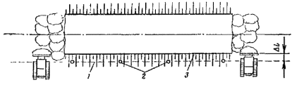 Рис. 9.8. Маятниковый отвес 9.3.16. Для кирпичной кладки от уровня чистого пола намечают ряд округленных до 0,5-1,0 м рабочих отметок, по которым ведут выравнивание кладки. Рядом с такими отметками прибивают порядовки (рейки с делениями для порядовой кирпичной кладки через 75 мм). Горизонтальность кладки контролируют натянутым шнуром между делениями порядовок. Вертикальность и горизонтальность рядов проверяют через 0,5 м. Замеченные отклонения устраняют в уровнях междуэтажных перекрытий. 9.3.17. Укладка плит междуэтажных перекрытий ведется после контроля расстояний между осями их опорных ригелей и прямолинейности балки. 9.3.18. Положение опалубки железобетонных перекрытий намечают от рисок осей или осей колонн. Верх опалубки определяют от отметок, вынесенных на грани стен или колонн. 9.4. Геодезические работы при строительстве труб9.4.1. Геодезические разбивочные работы при строительстве труб выполняются на основе данных проекта сооружения и исходных материалов проектной организации. 9.4.2. Местоположение оси трубы по трассе устанавливается промерами (с контролем) от ближайших пикетов. 9.4.3. Точка пересечения осей трубы и трассы закрепляется сторожком, относительно которого теодолитом переносится на местность угол между этими осями. 9.4.4. Продольная ось трубы закрепляется с обеих сторон трассы двумя контрольными знаками, устанавливаемыми не ближе 3 м от границы котлована, таким образом, чтобы их сохранность была обеспечена в процессе строительства. 9.4.5. При использовании этих знаков в качестве рабочих реперов их связывают нивелированием с ближайшими реперами. 9.4.6. Закрепление очертания фундамента производится относительно продольной оси трубы колышками или линиями на обноске, устраиваемой на расстоянии 1,0-1,5 м от границы котлована (за пределами работы землеройных машин). 9.4.7. По окончании возведения фундамента (точность ±5 см) на его поверхности отмечают основные характерные и осевые точки трубы. Контроль за правильностью сборки элементов трубы ведется относительно этих точек и знаков закрепления. 9.4.8. После укладки и сборки элементов сооружения выполняется исполнительная съемка. При этом особое внимание должно уделяться определению соответствия продольного уклона проектной величине. Раздел 10. ГЕОДЕЗИЧЕСКИЙ КОНТРОЛЬ И ИСПОЛНИТЕЛЬНЫЕ СЪЕМКИ10.1. Основные положения10.1.1. Геодезический контроль осуществляется за всеми видами дорожных и мостостроительных работ. 10.1.2. Контролю подлежат результаты всех выполненных строительно-монтажных работ, расположение каждого объекта относительно проектного, соответствие формы и размеров каждого элемента строящегося сооружения запроектированным и соответствие поверхности элементов сооружения заданным качественным характеристикам. 10.1.3. Все объекты и элементы строительно-монтажных работ, перекрываемые при строительстве другими объектами и элементами сооружения и в дальнейшем недоступные для обозрения, должны оцениваться в процессе промежуточного контроля, выполняемого перед их перекрытием. Такой контроль осуществляется в процессе приемки скрытых работ и по его результатам составляется специальный акт приемки. В акте указываются все отступления от проектных решений и все нарушения настоящих указаний и СНиП. 10.1.4. Геодезический контроль при реконструкции, капитальном и среднем ремонта