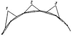 Рис. 6.1. Схема установки створных вех в плане: 1 - глаз наблюдателя; 2 - вехи-визирки; 3 - визирки на рабочем органе механизма