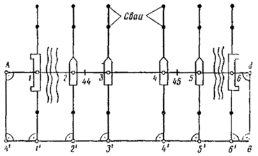 Рис. 7.4. Схема разбивки центров опор с использованием дублеров 7.2.2. Разбивку центров опор в плане производят вдоль оси сооружения или по створам, параллельным этой оси, расположенным за пределами строительных работ. Проектные расстояния откладывают от исходных точек до центров опор (рис. 7.3) или их дублеров (рис. 7.4) и прямыми угловыми, или створными засечками с точек базиса (рис. 7.5), или с пунктов мостовой триангуляции, трилатерации или точек линейно-угловой сети (рис. 7.6). 7.2.3. Линейные измерения производят светодальномерами, а также лентами и металлическими рулетками по специальным мосткам, устроенным на столбиках по суходолу и на спаях через реки небольшой глубины или по вмороженным в лед прокладкам. 7.2.4. Способ непосредственного отложения проектных расстояний от исходных точек А и В вдоль продольной оси сооружения до центров опор перехода - точек, 1, 2, 3, 4, 5, 6 (см. рис. 7.3) - рекомендуется применять при всех удобных случаях. 7.2.5. Проектные расстояния этим способом откладывают с повышенной точностью в прямом и обратном направлениях. 7.2.6. При измерениях мерными приборами вводят поправки за температуру и компарирование прибора. Их определяют и вводят в измеряемые расстояния на каждом пролете.