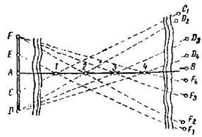 Рис. 4.1. Схема к использованию вех-визирок при земляных механизированных работах 4.3.6. Размещение створов и визирных поверхностей ведется из расчета непрерывной их видимости водителем строительной машины. Направление створа движения машины устанавливают двумя и более вехами, постоянно видимыми водителем со своего места. Направление визирной плоскости, составляемой несколькими горизонтальными планками вех-визирок, установленных на местности, и ходовой визиркой, установленной на рабочем органе машины, должно быть приподнято относительно заданной проектной плоскости на высоту глаза водителя машины (рис. 4.1). 4.3.7. Все виды разбивочных работ производятся при постоянном контроле на основании повторных измерений. При этом стремятся выполнять повторения иными приборами, приемами и методами чем при основных измерениях. 4.4. Разбивка поперечных профилей земляного полотна4.4.1. Разбивка поперечных профилей производится на прямых по перпендикулярам к оси дороги и на кривых по нормалям к кривым. Она выполняется теодолитом, эккером, построением прямого угла у треугольника со сторонами 3; 4 и 5 или каким-либо другим способом. 4.4.2. Для разбивки теодолитом поперечных профилей на прямых прибор устанавливается в соответствующей точке оси дороги. После совмещения нулей лимба и алидады теодолита ориентируют его визирный луч вдоль трассы. Затем алидаду поворачивают на 90° и по линии визирования закрепляют створ поперечника кольями или пешками. Восстановление створа и противоположную сторону выполняется после поворота алидады теодолита на 180°, а при отсутствии коллимационной ошибки - переводом трубы прибора через зенит. 4.4.3. Для восстановления перпендикуляра к оси дороги при помощи зеркального эккера его центрируют над точкой В трассы. В точках А и С по оси дороги выставляются вехи. Эккер следует повернуть так, чтобы луч, идущий от вехи С, попал на одну из зеркальных граней и после двойного сражения был бы виден наблюдателю. Веха D передвигается до ее совмещения с отражением вехи С в зеркале эккера (рис. 4.2). Аналогично производится восстановление перпендикуляра и другую сторону по линии ВЕ. Восстановление этой линии можно также произвести вешением, продолжая линию перпендикуляра DB.