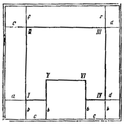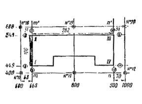 Рис. 9.4. Схема выноса осей сооружения на обноску 9.1.4. Для разбивки строений и различных промышленных зданий составляют специальный разбивочный чертеж с указанием размеров сооружения и положения его главных осей относительно пунктов строительной сетки (рис. 9.2). 9.1.5. Точки пересечения I, II, III, IV главных осей (рис. 9.2) выносят на местность методом прямоугольных координат. 9.1.6. Для закрепления разбиваемых осей обноску на плане сооружения проектируют строго параллельно главным осям здания на расстоянии, обеспечивающем ее сохранность при последующих земляных работах (рис. 9.3). На местности обноску строят от закрепленных точек (I, II, III, IV) пересечения главных осей, откладывая на их продолжении проектные расстояния a, b, c, d до обноски. 9.1.7. Построенная обноска должна удовлетворять следующим требованиям: 1) стороны обноски должны быть прямолинейны, параллельны осям сооружения и горизонтальны; 2) высота обноски должна быть в пределах 0,5-1,0 м от земли, чтобы над ее точками было удобно установить теодолит и производить линейные измерения. 9.1.8. На обноску выносят главные оси и основные внутренние оси сооружения (рис. 9.4). Главные оси выносят на обноску методом проектирования коллимационной плоскости при установке теодолита над закрепленными на местности точками пересечения главных осей (точки I, II, III, IV). Внутренние оси сооружения выносят методом линейных отложений на обноску проектных расстояний. 9.1.9. Основные оси сооружения, требующие высокой точности геодезических работ, дополнительно закрепляют грунтовыми закрытыми знаками, устанавливая их рядом с обноской на глубину 1,2-1,5 м. 9.1.10. Наносимое на обноску положение всех осей закрепляют гвоздями и вертикальной линией с записью наименования оси масляной краской. Кроме этого, оси закрепляют знаками, установленными за пределами строительных работ.