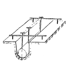 Рис. 9.5. Схема закрепления оси трубопровода на створных обносках Для проектирования осей в котлован вдоль осей натягивают проволоку без ее существенного провисания. Места пересечения осей с помощью передвигаемых по проволоке отвесов проектируют вниз, а затем от них (в соответствии с размерами) детально разбивают отдельные элементы сооружения. 9.1.11. Используя нивелирование вдоль осей, на обноске устанавливают постоянные планки-визирки, имеющие заданную и предварительно рассчитанную высоту. Ходовая визирка также имеет расчетную высоту. Визирки используют при определении положения ряда точек в процессе рытья котлованов или траншеи, зачистки их дна и откосов, устройства бетонной подготовки фундамента или его отдельных деталей и т.д. При этом используется третья ходовая визирка. 9.1.12. Положение осей трубопровода водостока и его колодцев закрепляют на спорных обносках (рис. 9.5). Каждая такая обноска состоит из двух деревянных столбов, устанавливаемых на краю траншеи на высоте 0,5-1,0 м от поверхности земли с прибитыми к ним горизонтальными досками. Положение оси трубопровода в колодце указывают на визирках гвоздиками, а планки визирок промежуточных обносок устанавливают параллельно трубопроводу. Натянув проволоку по оси между смежными обносками, перемещают вдоль нее проволоку-причалку с отвесом, указывающим плановое положение в траншее и в котловане. Глубина разрабатываемой траншеи или котлована определяется ходовой визиркой, имеющей длину проектной глубины траншеи. 9.2. Разбивка при рытье котлованов, возведении фундаментов и опор сооружений9.2.1. При устройстве фундаментов и установке опор сборных конструкции в проектное положение разбивочные работы выполняют в следующей последовательности: с концов осей сооружения методом створной засечки теодолитом проектируют в котлован, подготовленный для устройства или установки фундамента, продольные и поперечные оси опоры. По мере сооружения фундамента контролируют положение продольных и поперечных осей, перенося их на опалубку и грани стаканов. 9.2.2. Разбивку контура котлована или траншеи ведут от осей с учетом откосов и беспрепятственной установки на дне опалубки, бровки траншеи закрепляют колышками, а их положение отмечают на обноске. 9.2.3. При разбивке котлованов и траншей необходимо следить за тем, чтобы не было в них переборов земли. Перед зачисткой дна проверяют соответствие его положения проектному. Недоборы не должны превышать 5 см. Для зачистки дна и откосов крупных котлованов разбивают сетку пересечения продольных и поперечных осей фундаментов сооружения. Вдоль сторон и в углах такой сетки ставят колышки под проектные отметки. 9.2.4. При разработке глубоких выемок или котлованов работы ведут в несколько ярусов, а для обеспечения направления откосов устанавливают лекала, закрепляя их положение направляющими траншеями. Направляющие траншеи разбивают вдоль откоса многоковшовыми экскаваторами примерно через 50 м. 9.2.5. Нижнюю бровку выемок и котлованов помечают на местности лишь при разработке нижнего горизонта, а направление последующих проходок экскаватора после обозначения бровки ведут с использованием визирок, глубиномеров или других устройств. 9.2.6. Дно и откосы больших выемок и котлованов обычно зачищают грейдерами, планировочными машинами или бульдозерами с