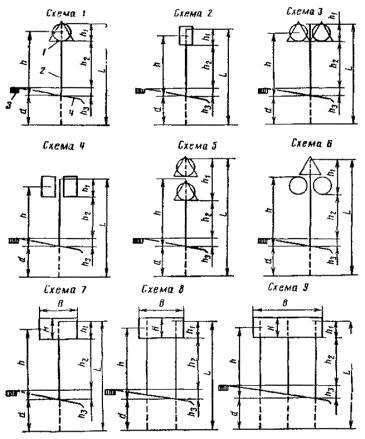 Рис. 4.1. Расчетные схемы опор для установки дорожных знаков: 1 -дорожный знак; 2 –опора; 3 –покрытие автомобильной дороги; 4 - присыпная берма (обочина) При установке на одной опоре нескольких знаков по горизонтали или по вертикали очередность их размещения по отношению к краю проезжей части или сверху вниз должна быть следующей: знаки приоритета; предупреждающие; предписывающие; запрещающие; информационно-указательные; сервиса. При размещении на одной опоре знаков одной группы очередность их расположения определяется номером знака в группе. Если при выезде на дорогу с односторонним движением устанавливается несколько знаков, то знаки 5.7.1 и 5.7.2 располагают под другими знаками. 4.3.12. Расстояние между соседними знаками, размещенными на одной опоре, за исключением знаков, выполненных в одном корпусе, должно составлять от 50 до 200 м. 4.3.13. Расстояние от кромки проезжей части, а при наличии обочины - от бровки земляного полотна до ближайшего к ней края знака, остановленного сбоку от проезжей части, должно составлять от 0,5 до 2 м, а до края информационно-указательных знаков 5.20.1, 5.21.1 - 5.27, 5.31 - от 0,5 до 5 м. 4.3.14. На дорогах I и II категорий указатели направлений движения, рекомендуется устанавливать над обочиной на Г-образных опорах, над проезжей частью - на П-образных опорах. Опоры несущих конструкций должны располагаться на бермах на расстоянии не менее 0,5 м от бровки дороги или края разделительной полосы. Бермы для знаков устраиваются с таким расчетом, чтобы расстояние от стоек знаков до краев бермы было не менее 0,75 м. 4.3.15. На дорогах в горной местности допускается установка опор дорожных знаков на обочинах. В стесненных условиях (у обрывов, выступов скал, парапетов и т.п.) расстояние между кромкой проезжей части и ближайшим к ней краем знака должно составлять не менее 1 м; высота установки знака - не менее 2 м. Опоры рекомендуется устанавливать за парапетом со стороны откоса, встраивать в блоки парапета или устанавливать между отдельными блоками парапета. На участках, где установлены ограждения, рекомендуется располагать опоры знаков за ограждениями со стороны откоса ближе к опорам ограждений или закреплять непосредственно на опорах ограждений. 4.3.16. Предварительные указатели направлений и указатели расстояний следует устанавливать на опорах, расположенных на присыпанных к обочине бермах, откосах насыпей и выемок или на полосе отвода за боковой канавой. На участках, где установлены ограждения, опоры знаков, следует располагать ближе к опорам ограждений так, чтобы расстояние между краем знака и опорой было не менее 0, 75 м. 4.3.17. Расстояние от нижнего края знака (без учета знаков 1.4.1-1.4.6 и табличек) до поверхности дорожного покрытия (высота установки) должно составлять: 1,5 до 2,2 м при установке сбоку от дороги вне населенных пунктов, от 2 до 4 м в населенных пунктах; от 5 до 6 м при размещении над проезжей частью или обочиной, при размещении знаков на пролетных строениях искусственных сооружений; при расстоянии от поверхности дорожного покрытия до низа пролетного строения сооружения не менее 5 м знаки не должны выступать за их нижний край; не менее 0,6 м при установке на островке безопасности и на проезжей части. 4.3.18. Стойки дорожных знаков могут быть выполнены из дерева, железобетона, отходов металлических труб, асбестоцементных труб и других материалов