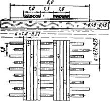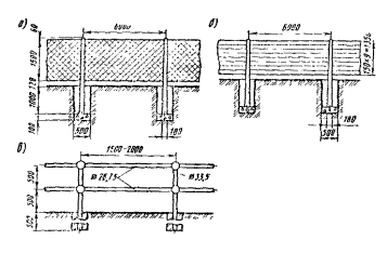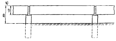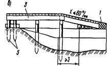 где 9.8.14. Для усиления льда копейным настилом рекомендуется конструкция, приведенная на рис. 9.15. Поперечины укладывают по выровненной поверхности льда и по возможности вмораживают. Деревянный настил повышает грузоподъемность льда толщиной 20-40 см до массы 20-25 т. 9.8.15. Сопряжение льда с берегом устраивают в виде: непосредственных съездов, покрытых фашинными или хворостяными тюфяками и засыпанных уплотненным снегом (рис. 9.16, а), если лед у берега имеет толщину и прочность такую же, как на реке, и глубина воды возрастает постепенно; переходных мостиков (рис. 9.16, б, в), если лед у берега имеет низкую прочность.