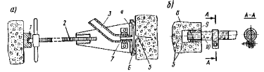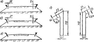 Рис. 9.3. Ремонт трещин методом инъектирования: а - поверхностный иньектор; б - простой инъектор; 1 - шарнир упора; 2 - винтовой домкрат; 3 - резиновый шланг; 4 - стальная плита; 5 – трещина; 6 - резиновый уплотнитель; 7 - стальная трубка; 8 - шпур; 9 - пакля; 10 - газовая трубка. 9.2.27. Отдельные трещины с общим раскрытием до 2 мм могут быть разделаны путем вырубки вдоль трещины пазов 1´1,5 см и после очистки заполнены полимерцементным тестом, в состав которого входят 44 %-ная латексная эмульсия СКС-65ГП, цемент и вода в соотношении 100:650:70. 9.2.28. Трещины с общим раскрытием свыше 2 мм в обычных условиях и более 0,2 мм в условиях агрессивной среды рекомендуется инъектировать под давлением полимерцементными составами. Для инъектирования трещин используют инъекторы (рис. 9.3), инъекционные трубки, гибкие шланги, ручные насосы или пневматические нагнетатели (при больших объемах работ), работающие от компрессора. 9.2.29. При повреждении защитных покрытий в местах соприкосновения поверхности опор с грунтом их восстанавливают путем нанесения обмазочной гидроизоляции. Для холодной обмазочной гидроизоляции применяют следующие составы мастик (% по массе): 1) битум марки БН-III (БН-IV) - 65-70; растворитель (бензин, лигроин, керосин и пр.) - 35-30; 2) битум марки БН-IV-55; растворитель - 25; асбест 6-7 сорта 20. Обмазочную гидроизоляцию выполняют в два слоя по грунтовочному слою. В качестве грунтовочного слоя используют битум и растворитель в соотношении по массе (25-5)¸(65-75). 9.2.30. Наружные поверхности фасадных элементов пролетных строений после ремонта окрашивают полимерцементными или синтетическими красками. 9.2.31. В сборных пролетных строениях повреждения в сварных стыках диафрагм между балками (срез и изгиб накладок) устраняют путем подварки старых или приварки новых металлических накладок взамен поврежденных. Изогнутые (в плане) накладки заменяют, приваривая новые накладки с использованием дополнительных прокладок (рис. 9.4). Накладки с дефектами срубают по сварным швам. Работы по замене накладок выполняют при ограниченном режиме движения по мосту (скорости и нагрузки). Накладки следует заменять одновременно не более чем в одном стыке диафрагм. Новые накладки после их приварки очищают от ржавчины и окрашивают синтетическими или полимерцементными красками.