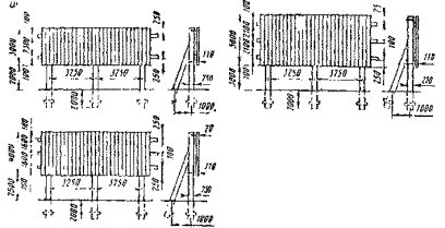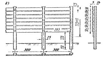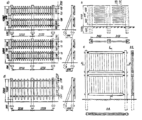 где Q - объем снега у многорядных защит, м3/м; 6.3.9. Первый ряд забора устанавливается от бровки земляного полотна на расстоянии от 15 до 25 высот забора. Большее расстояние принимают при ветре, направление которого составляет с осью дороги угол, близкий к прямому, и при уклоне местности от забора к дороге. Меньшее расстояние назначают при ветре, направленном под острым углом к дороге, и относительно равной прилегающей местности. Если по местным условиям нельзя расположить забор на указанном расстоянии, допускается сокращение расстояния до 10 высот забора при уменьшении просветности его решетки до 30 %. 6.3.10. Снегозадерживающие заборы устраивают: двухпанельные с просветностью решетки панелей 50 % при устройстве заборов в один ряд или в ближайшем к дороге ряду при устройстве заборов в несколько рядов (рис. 6.3, а); однопанельные с просветностью решетки 70 % для остальных рядов многорядных заборов (рис. 6.3,6); железобетонные высотой 4 м (рис. 6.3, в); с регулируемой просветностью (рис. 6.3, г).