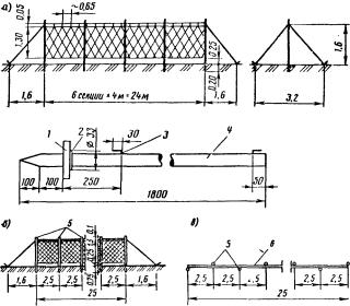 Рис. 6.6. Снегозадерживающие полиэтиленовые сетки: а - тип I на стойкие на металлических труб; б - тип II на деревянных кольях; в - размещение кольев; 1 -стопорная шайба 15´150´5 с отверстием Æ33 мм; 2 - упор; 3 - крепление для сетки Æ5 мм; 4 - стальная труба Æ30-24 мм; 5 - деревянные колья Æ80-100 мм; 6 - сетка Таблица 6.4