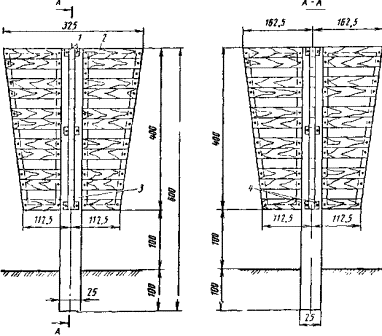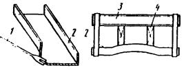 Рис. 9.7. Ремонт устоя стальным каркасом: 1 - тяжи из стали диаметром 25-30 мм; 2 - трещина; 3 - спаренные швеллеры; 4 - распределительные прокладки из рельсов.