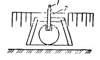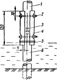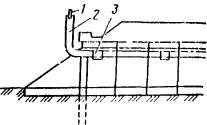 Рис. 6.13. Устройство для оттаивания льда, заполнившего отверстие водопропускной трубы: 1 - деревянная пробка; 2 - металлическая труба d=25 мм; 3 - скоба для закрепления трубы - на стенке звена.