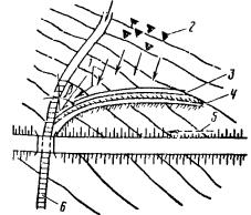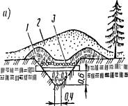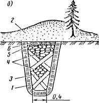Рис. 6.14. Утепленные водоотводные канавы: 1 - мох, торф слоем 20-50 см в плотном теле; 2 - снегонакопление; 3 - жерди d=14-20 см; 4 -камень; 5 - засыпка по типу обратного фильтра; 6 - дерн 15 см