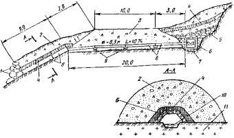 Рис. 6.16. Каптажно-дюкерное устройство: 1 - подпор из крупных камней для утеплительного слоя; 2 - привозной грунт; 3 - земляное полотно; 4 - утеплительный слой; 5 - фильтр; 6 - арычный лоток; 7 - дюкер;8 - водоотводная труба; 9 - железобетонная подушка; 10 - каптированная ключевая труба; 11 - скальный грунт.