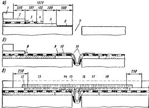 Рис. 9.1. Ремонт шва закрытого типа: а - ступенчатая вырубка слоев одежды; б - устройства изоляции; в - устройство защитного слоя асфальтобетонного покрытия; 1 - асфальтобетонное покрытие; 2 - защитный слой; 3 - гидроизоляция; 4 - поврежденный участок изоляции; 5 - выравнивавший слой; 6 - очищенная поверхность балок; 7 - зазор; 8 - выпуск арматуры; 9 - восстановленный выравнивающий слой; 10 - новым изоляционный слой; 11 - полиэтиленовая пленка; 12 - окантовочная доска; 13 - новый защитный слой; 14 - пористый заполнитель петли 15 - уплотнитель зазора (доска, пенопласт); 16- нижний слой покрытия; 17- арматура защитного слоя; 18 - уровень верхнего слоя покрытия