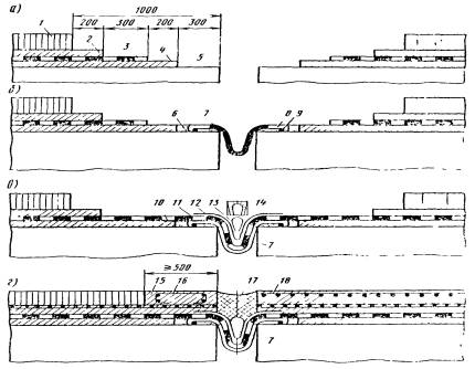 Рис. 9.2. Ремонт швов заполненного типа: а - ступенчатая вырубка слоев одежды; б - установка металлического компенсатора; в - устройство гидроизоляции; г - устройство покрытия и заполнение зазора; 1 - асфальтобетонное покрытие; 2 - защитный слой; 3 - гидроизоляция; 4 - выравнивающий слой; 5 - поверхность балок; 6 - полимерраствор; 7 - металлический компенсатор; 8- анкерные полосы компенсатора; 9 - продольный стержень; 10 - рулонный изоляционный материал поверх компенсатора; 11 - новый изоляционный слой; 12 - полиэтиленовая пленка; 13 - пористый заполнитель; 14 - опалубочная доска, удаляемая после восстановления защитного слоя; 15 - бетонный прилив; 16 - арматурный каркас; 17 - мастика; 18 - бетонное покрытие При восстановлении швов заполненного типа также извлекают существующую конструкцию шва со ступенчатой вырубкой слоев одежды, затем устанавливают металлический компенсатор, по нему укладывают рулонный изоляционный материал и устанавливают гидроизоляцию, петлю шва заполняют пористым материалом, зазор заполняют мастикой после восстановления защитного слоя и покрытия над балками (рис. 9.2). Восстановление швов со скользящими металлическими листами включает в себя замену поврежденной части окаймления и элементов шва. 9.2.16. При повреждении изоляции (всей или на нескольких участках проезжей части вдоль и поперек пролета) ее восстанавливают по всему пролетному строению, а при наличии признаков нарушения ее только вдоль крайних балок ремонт производят на ширине 1 м вдоль тротуара пролетного строения. При локальном повреждении отдельных участков изоляцию ремонтируют на участке с радиусом не менее 1,5 м в сторону от места фильтрации воды. Признаками повреждения изоляции являются потеки извести на нижней поверхности плиты (сталактиты), фильтрация воды через плиту и др. Особенно тщательно ремонтируют изоляцию в местах расположения бордюров, водоотводных труб, деформационных швов. 9.2.17. В зависимости от повреждения гидроизоляции могут быть рекомендованы следующие способы ее восстановления: замена гидроизоляции с удалением и последующим восстановлением защитного слоя и покрытия; устройство дополнительного изоляционного слоя по защитному слою, если при этом не будет снижена грузоподъемность сооружения; придание гидроизоляционных свойств защитному слою; локальный ремонт гидроизоляции у деформационных швов, вдоль тротуаров, у водоотводных труб. 9.2.18. Замена гидроизоляции предусматривает устройство новой в соответствии с Инструкцией ВСН 32-81 Минтрансстроя СССР. При устройстве гидроизоляции по защитному слою удаляют асфальтобетонное покрытие на мосту, устраивают штрабу вдоль тротуара глубиной 20-30 и шириной 10-20 мм, заполняют мастикой, затем зачеканивают и изолируют швы тротуарных блоков, подготавливают поверхность защитного слоя и по нему устраивают новую гидроизоляцию, а также защитный слой и покрытие, которые могут быть выполнены из асфальтобетона. В случае незначительной фильтрации воды через плиту производят улучшение гидроизоляционных свойств одежды. Для этого поверхность защитного бетонного слоя пропитывают гидрофобизирующими материалами (например, 10 %-ной эмульсией кремнийорганической жидкости 136-41), исключающими проникание воды через толщину защитного слоя. Одновременно зачеканивают швы тротуарных блоков и устраивают штрабу вдоль тро