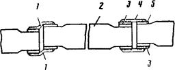 Рис. 9.4. Конструкция отремонтированного участка стыка диафрагм на сварных накладках: 1 - неправильно приваренная накладка; 2 - диафрагма; 3 - дополнительная прокладка; 4 -правильно приваренная накладка; 5 - закладная планка. 9.2.32. При сколе торцов балок с повреждением зоны их опирания производят восстановление конструкции. Для этого балка должна быть поддомкрачена с поврежденного конца и отремонтирована с помощью полимербетона на основе эпоксидных смол (см. п. 9.2.15). Опорные зоны усиливают швеллерами или стальным листом, приклеенными снизу балки эпоксидным клеем к бетону (рис. 9.5). 9.2.33. Железобетонные валки в опорных частях, имеющие сколы и трещины и резиновые опорные части с дефектами, заменяют. Для этого пролетное строение поддомкрачивают с опоры или специально устроенных подмостей и под него подводят в проектное положение новые опорные части. 9.2.34. В случае повреждения