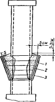 Рис. 9.6. Конструкция отремонтированного участка стойки опоры 1 - металлический каркас (или сетка); 2 - полимербетон; 3 -деревянная опалубка. Для предупреждения разрушения раствора в швах на большую глубину необходимо выполнять своевременно расшивку швов и, особенно в пределах колебания горизонта вод и ледохода. Швы предварительно очищают от слабого раствора, пыли и грязи на глубину до 6 см и промывают струей воды. Подготовленные швы заполняют цементным или полимерцементным растворами. Поврежденные камни кладки следует заменять новыми с соответствующей разделкой швов. Если кладка имеет пустоты, каверны, щели, необходимо производить ее цементацию водоцементным тестом под давлением. 9.2.36. В случае значительного разрушения стоек опоры (повреждение бетона и арматуры) воздействием ледохода, высоких вод необходимо усилить опору путем объединения стоек в общий массив монолитным бетоном. Работы выполняют по соответствующим проектам.